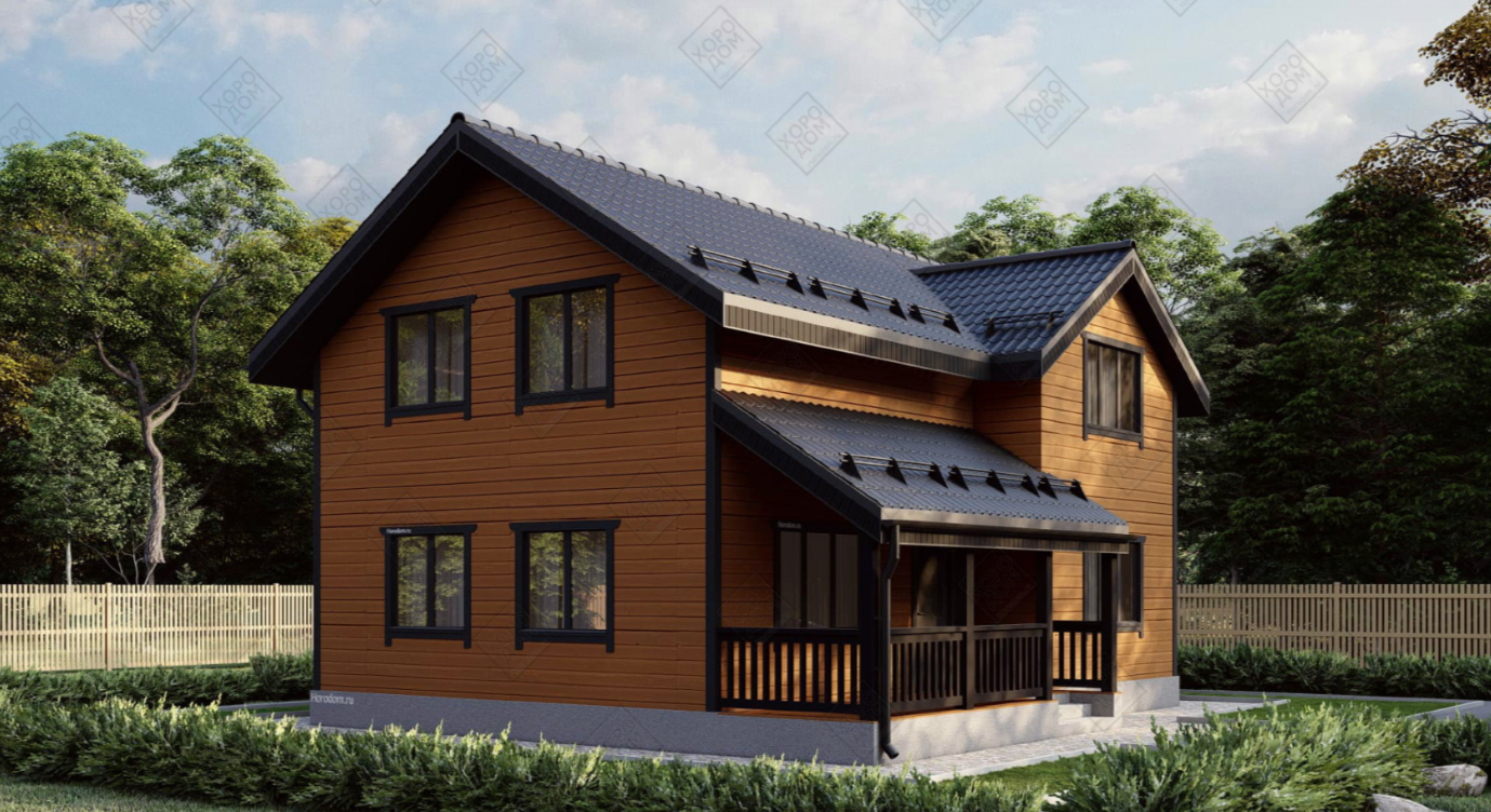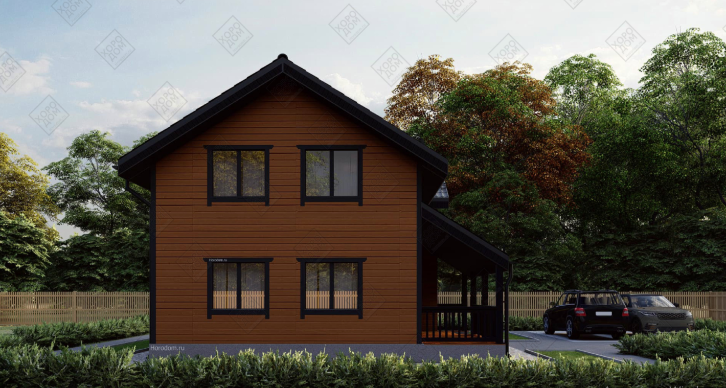 Проект Нарва представляет собой современный двухэтажный коттедж в каркасном исполнении. Снаружи дом выглядит очень стильно и эффектно. Особенно выделяется центральный фасад с большим панорамным остеклением и эркером. Такой архитектурный прием позволяет увеличить внутреннее пространство и сделать его более объемным.